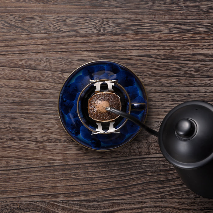 (3)少量のお湯を注ぎ、約20秒蒸らした後、2~3回に分けてお湯を注いでください。(できあがり約130~140ml)